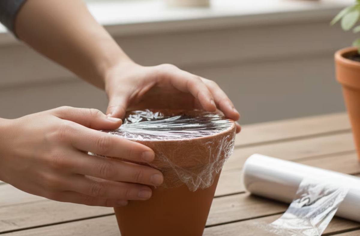 Para manter a humidade do substrato: para mim, essa é a principal razão. Cubro o vaso com película para evitar que a humidade evapore muito rapidamente do solo. Isso salva as minhas flores em dias quentes ou quando elas precisam permanecer mais tempo em solo húmido. Ao cobrir parcialmente a superfície, reduzo a evaporação e a planta sofre menos stress.