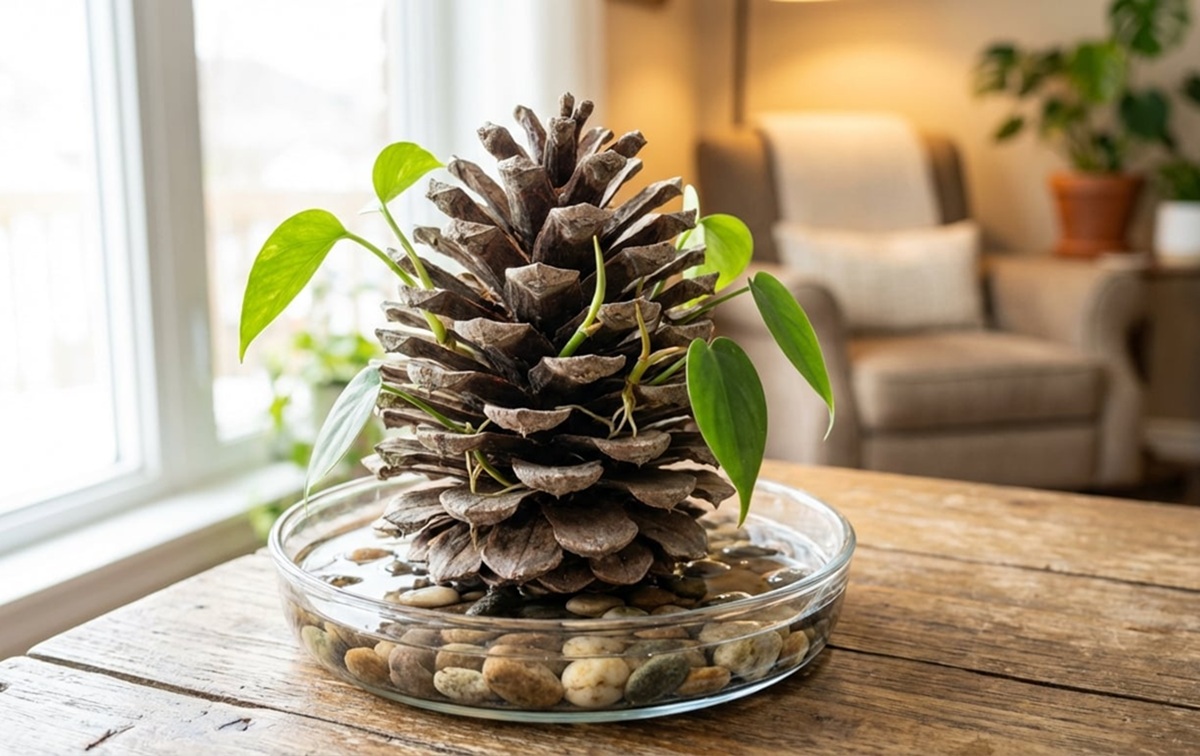Um pinhão não é apenas uma lembrança de um passeio: ele reage à humidade. Quando o ar está seco, as suas escamas abrem-se amplamente. Quando está molhado, a madeira absorve água e as escamas fecham-se, prendendo o que está entre elas. Brincando com esse movimento natural, obtém-se uma pinça vegetal perfeita para manter as estacas bem direitas.